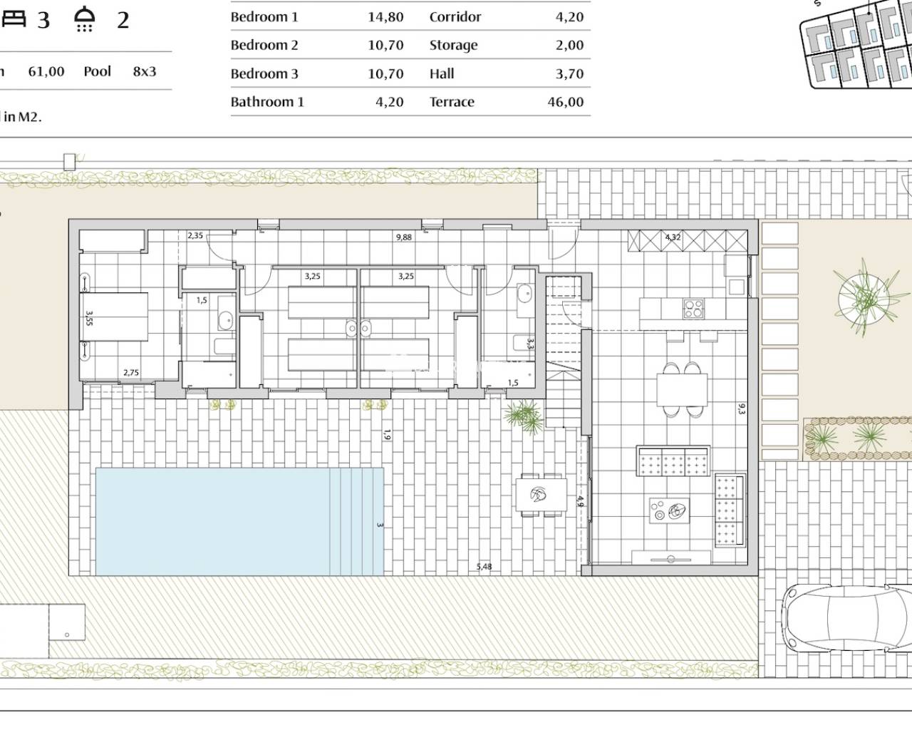 Die Villen selbst sind sehr praktisch gebaut und verfügen über 3 Schlafzimmer, 2 Bäder, ein schönes geräumiges Wohnzimmer mit offener Küche, einen Abstellraum und eine schöne Terrasse mit privatem Pool.
