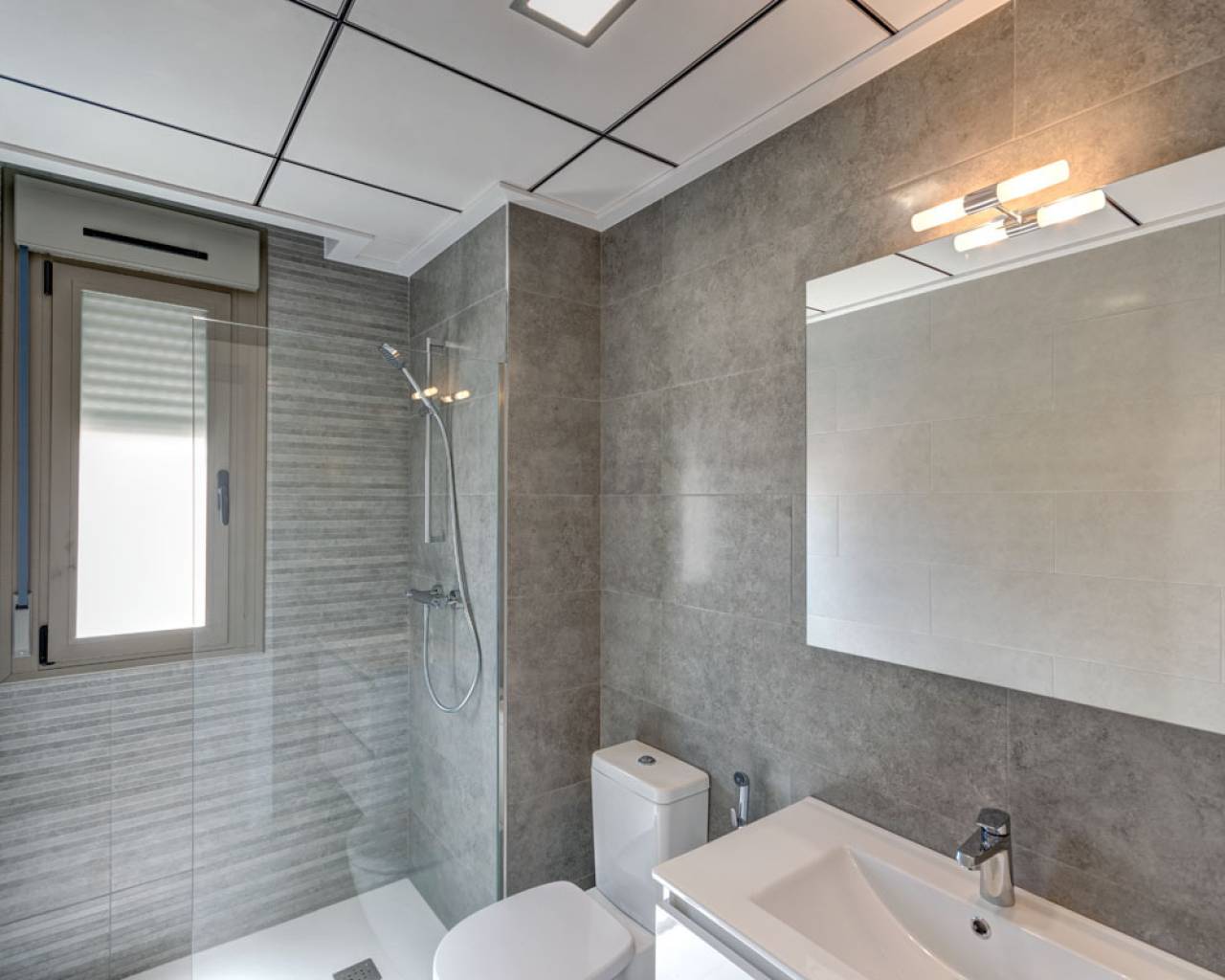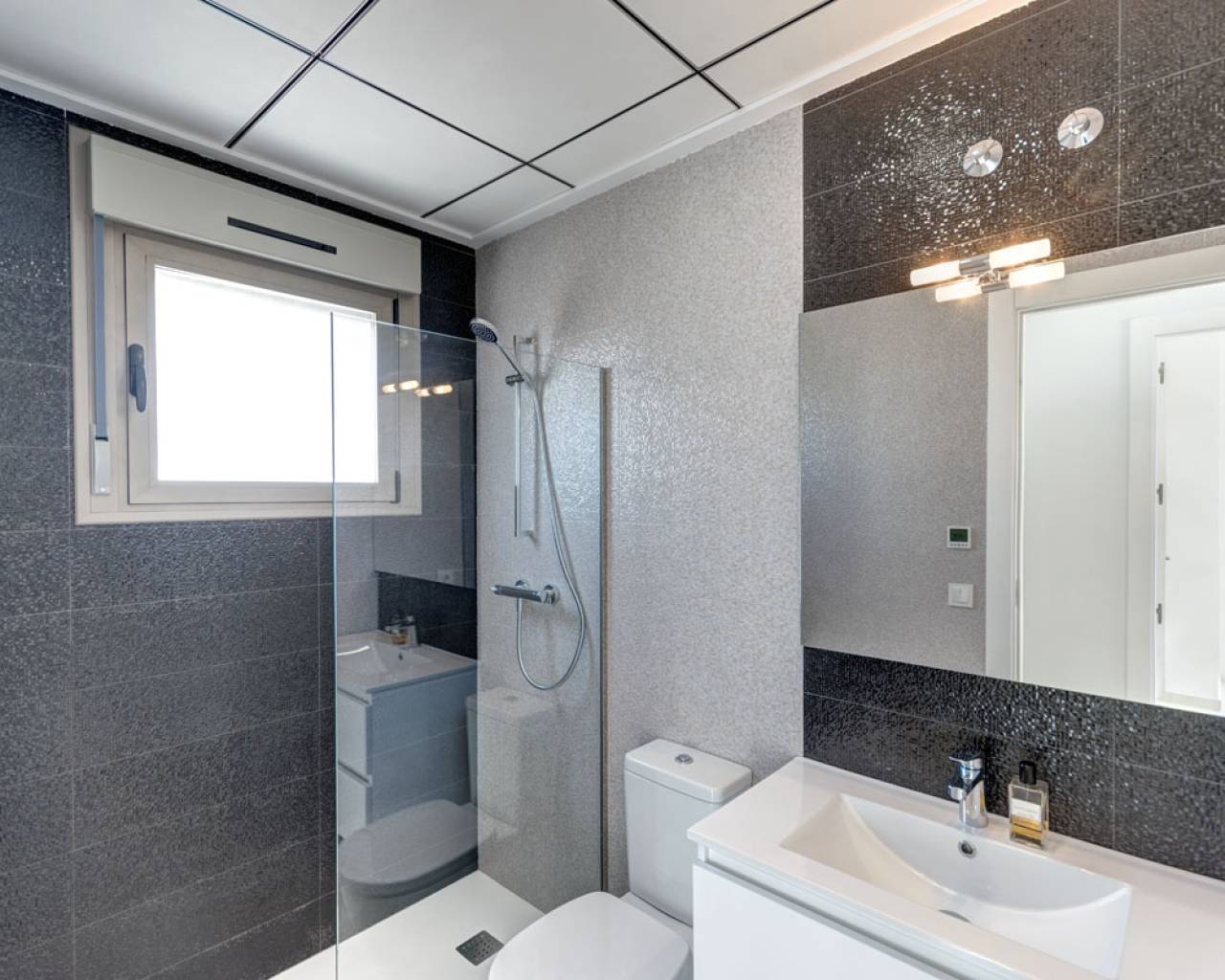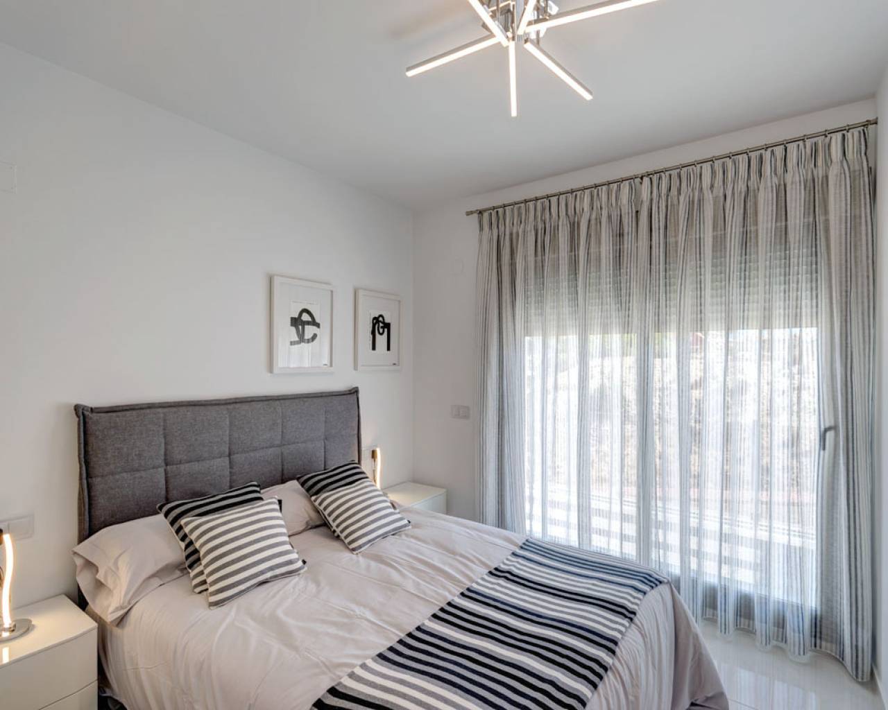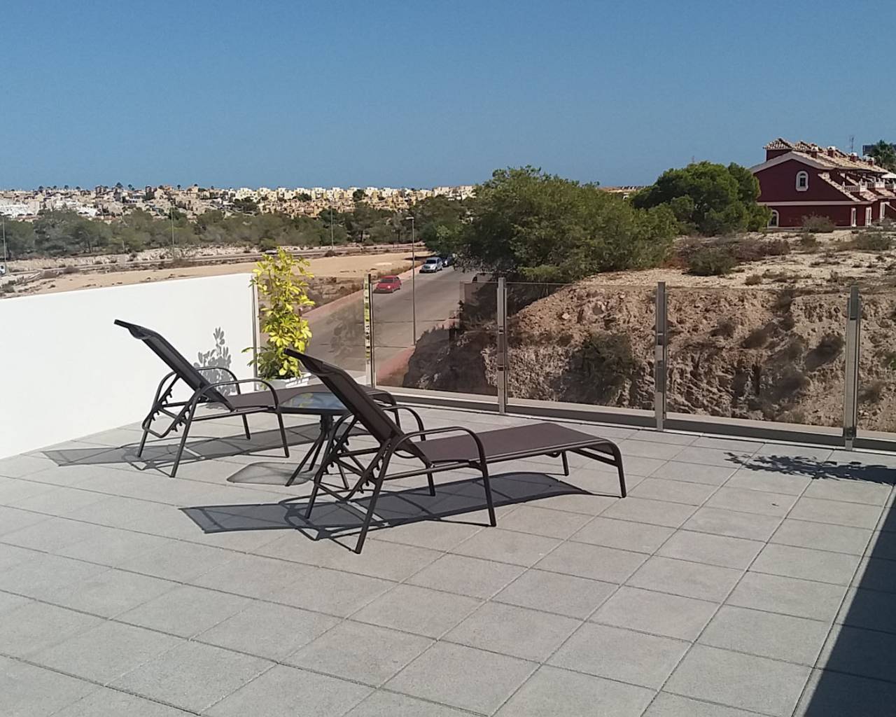 Im Erdgeschoss befindet sich ein geräumiges Wohnzimmer, eine Küche, ein Waschraum, ein Schlafzimmer und ein Badezimmer. Das Wohnzimmer verfügt über enorme Glasflächen, die den Eindruck von Geräumigkeit geben. Auf der Etage gibt es zwei Schlafzimmer und zwei Bäder, beide en-suite. Auf dieser Ebene gibt es auch eine große Sonnenterrasse. Eine Treppe führt Sie weiter in die oberste Etage, wo sich die große Dachterrasse mit herrlichem Meerblick befindet. Die Parzellen von minimal 200 m2 bieten ausreichend Platz für den Pool.