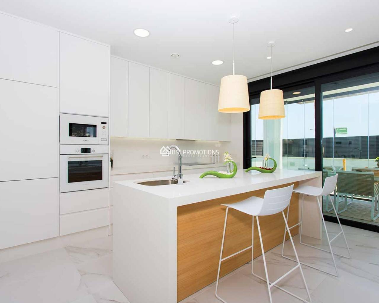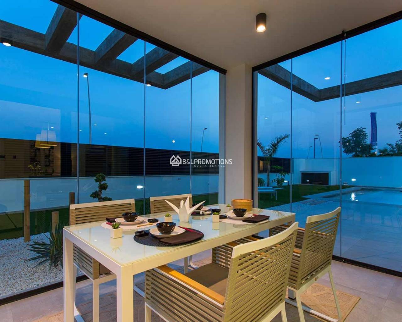 Die Villen haben im Erdgeschoss ein geräumiges Wohnzimmer mit offener Küche, ein Schlafzimmer mit Badezimmer und eine große überdachte Terrasse. Neben dem Eingang gibt es ein Garage mit Waschküche. Eine elegante Treppe mit Glasgeländer führt in den ersten Stock wo es zwei große Schlafzimmer, jedes mit eigenem Badezimmer und eine große Terrasse gibt. Von den Terrassen hat man einen schönen Blick auf das Mar Menor und seine Inseln. Im Garten gibt es einen L-förmigen Pool. Die Villen werden geliefert mit Küchengeräten, Klimaanlage mit Wärmepumpe ausgestattet mit der Klimazonensystem, elektrische Rollläden, Kamin von innen und außen sichtbar mit Ethanol Brenner und Fußbodenheizung in den Bädern. Die Häuser werden auf großen Grundstücken von mindestens 460 m2 gebaut und die Gärten werden vollständig bepflanzt. Es gibt nur 10 Grundstücke zur Verfügung in dieser schöne Lage.