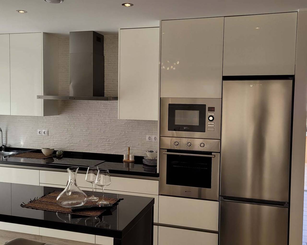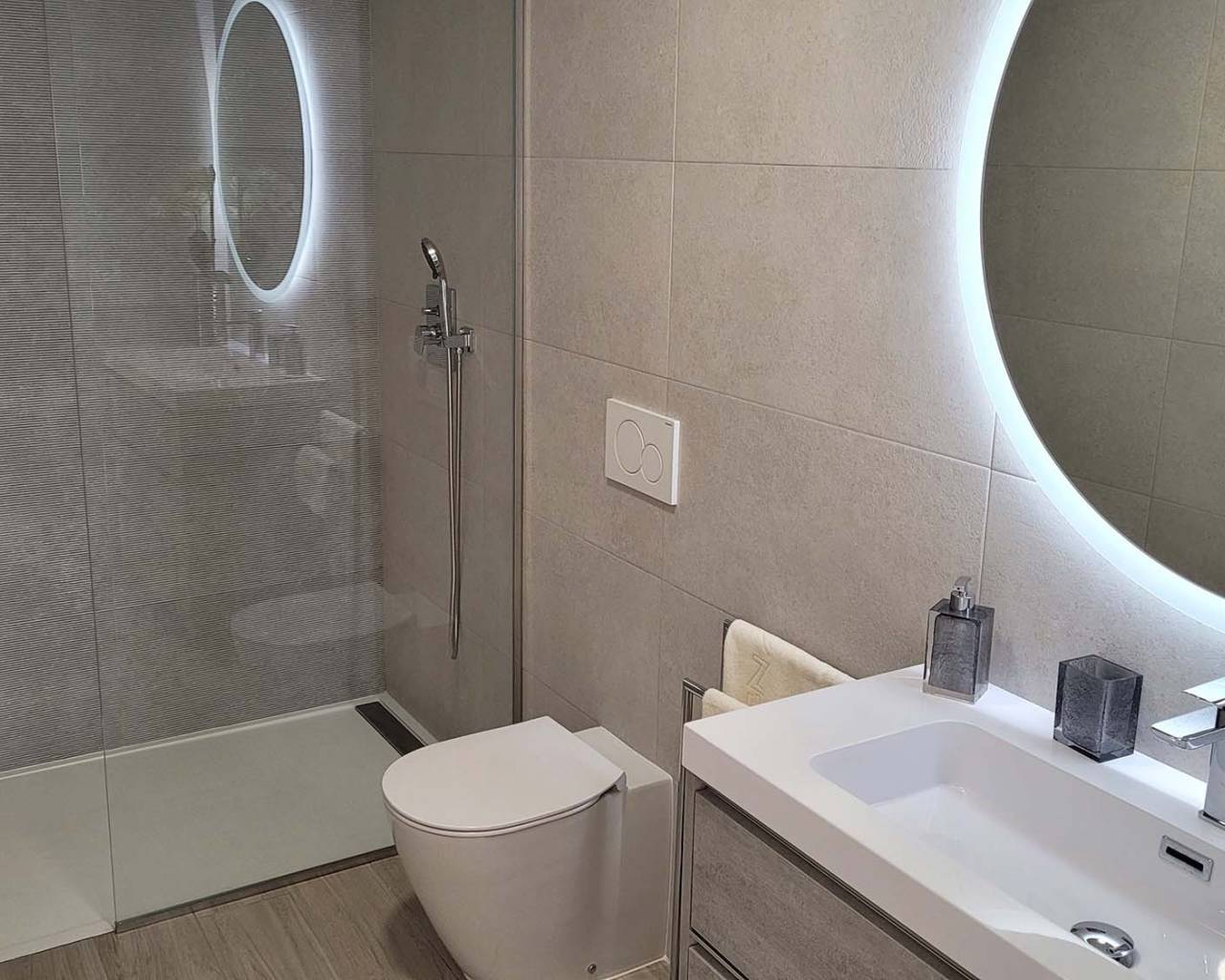 Die Wohnungen sind sehr geräumig. Sie verfügen über ain Wohnzimmer mit offener Küche von über 35 m2, 2 große Schlafzimmer, 2 luxuriöse Badezimmer mit Fußbodenheizung und eine riesige Terrasse.