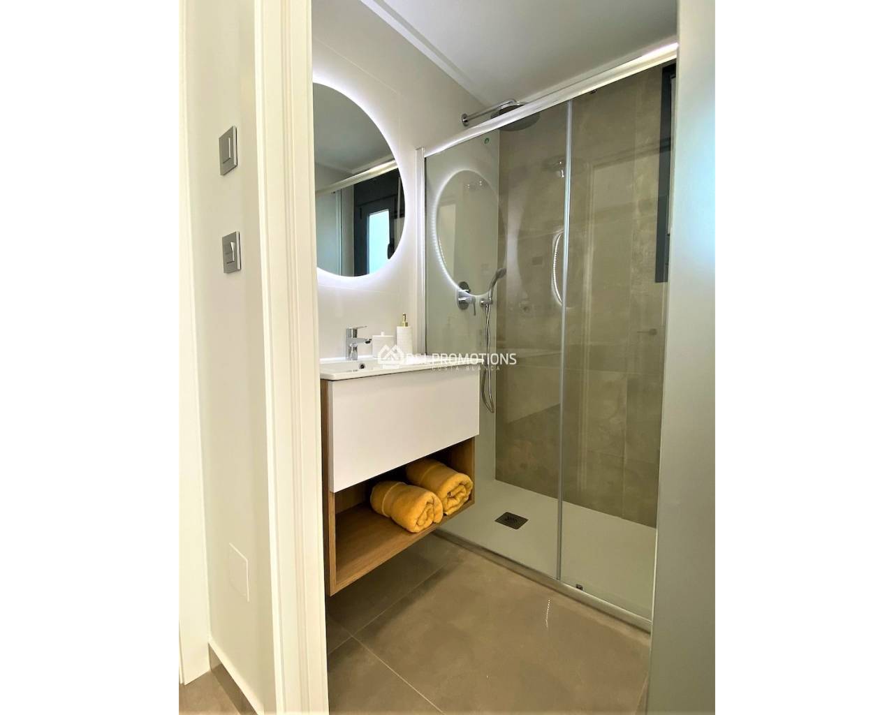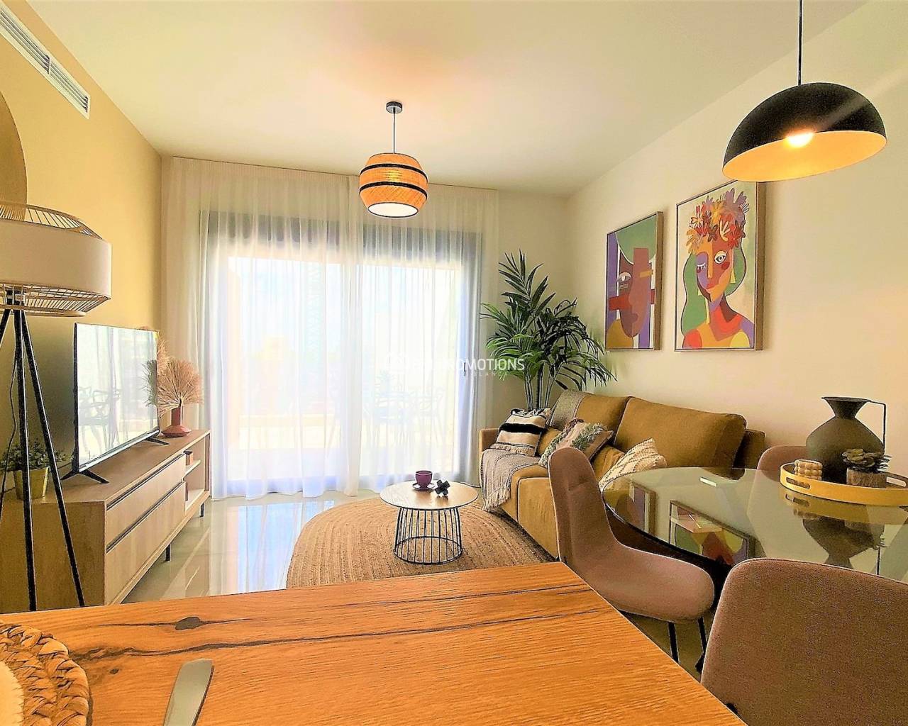 Hier haben wir geräumige Wohnungen mit 2 Schlafzimmern, 2 Bädern, großem Wohnzimmer, offener Küche und eine große Terrasse.
