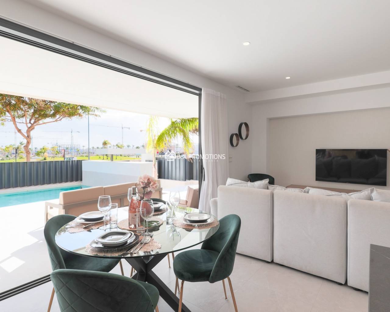 Jede Villa verfügt über drei großzügige Schlafzimmer, jeweils mit eigenem Bad, ein zusätzliches Gäste-WC sowie einen lichtdurchfluteten Wohn- und Essbereich von über 40 m². Die offene, voll ausgestattete Küche mit hochwertigen Marken-Elektrogeräten verbindet sich harmonisch mit dem Wohnbereich und führt direkt auf die großzügige Terrasse mit privatem Pool. Ein echtes Highlight ist die über 4,5 Meter breite Schiebetür, die vollständig in der Wand verschwindet – so verschmelzen Innen- und Außenbereich zu einer Einheit.