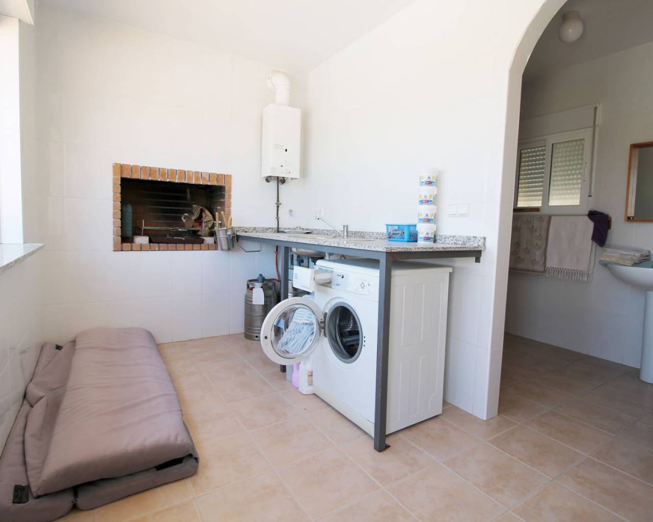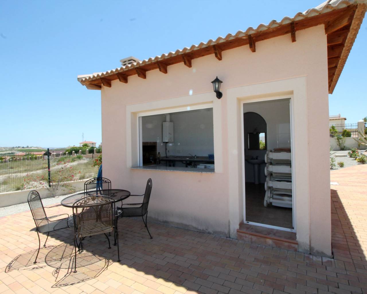 The country house is situated on a large, completely fenced plot of 2.000 m2. The plot has a slight slope, giving it a freestanding view of the beautiful valley and the mountains. The villa has a total area of almost 200 m2, it has an entrance hall, a huge living room of almost 60 m2, a beautiful kitchen, 3 spacious bedrooms with fitted wardrobes and 2 bathrooms. The living room has two sliding doors to a beautiful partially covered terrace, with views over the plot, the swimming pool and the valley. Next to the beautiful swimming pool there is a building with a summer kitchen, shower and toilet.