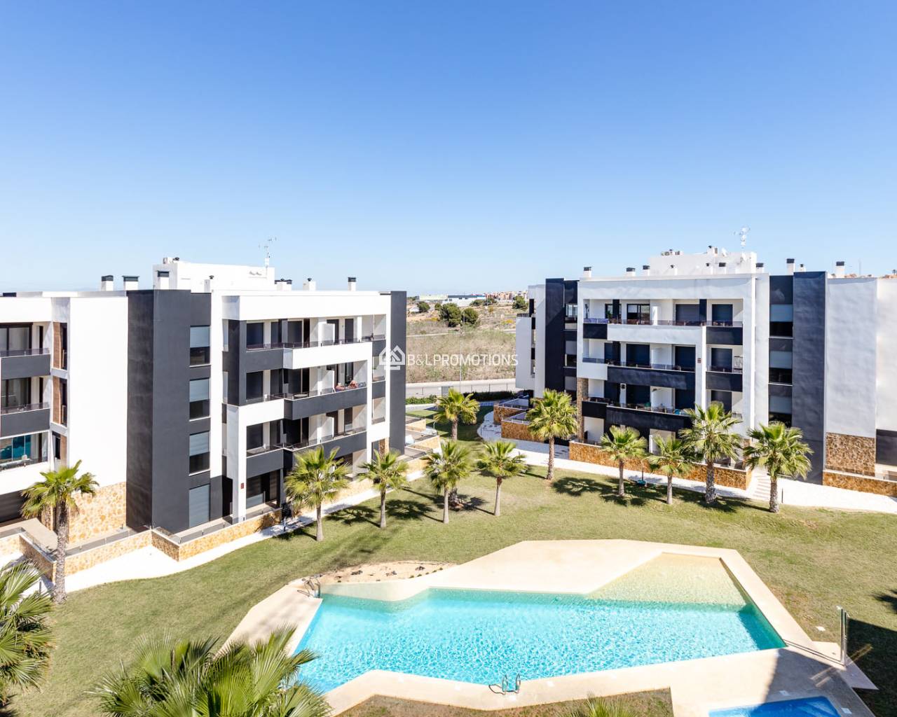 The house is built on one level. From the hall you enter the spacious living room with open kitchen, 3 bedrooms, 2 bathrooms, a beautiful covered terrace with a summer kitchen and an open terrace with private swimming pool. From the terrace a staircase leads to the roof terrace, from where you have a beautiful open view. In the resort there is also a communal swimming pool.