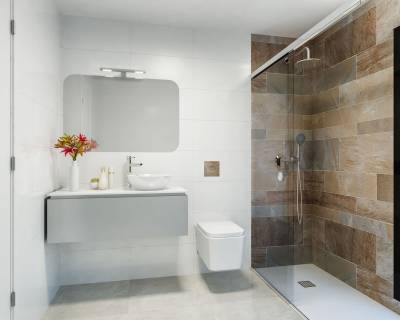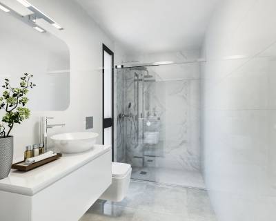 In Golf resort La Finca, Algorfa, you can find a new complex with individual villas and semi-detached houses. La Finca Golf has 18 holes, where an important tournament is played every year and where Hotel La Finca is located on the edge of the golf course. The complex is located 3 km from Algorfa, a small typical Spanish village, where shops, restaurants,bars and recreation can be found, although we must not forget that these services can also be found in the area of the golf course. Guardamar beach can be found at about 10 minutes away and the shopping center La Zenia Boulevard and the beaches about 15 minutes. Alicante airport can be reached in about 40 minutes. The semi-detached houses are built in an area of La Finca Golf where you have beautiful views and you can enjoy the green surroundings. It has 3 bedrooms and 2 bathrooms spread over 2 floors. The living room with open kitchen is spacious with many windows, some fixed and others with sliding doors that give direct the pool and terrace . There’s a parkingplace on the plot. The materials used for these houses are modern and of high quality. A lot of thought has gone into details and that's to be found in the finishes of the house.