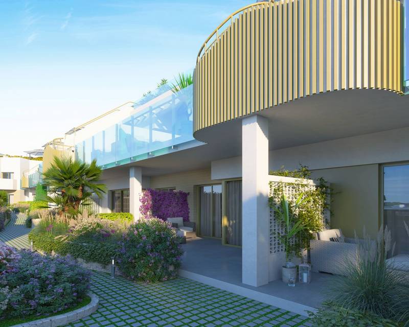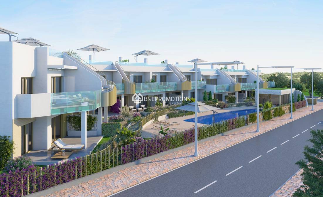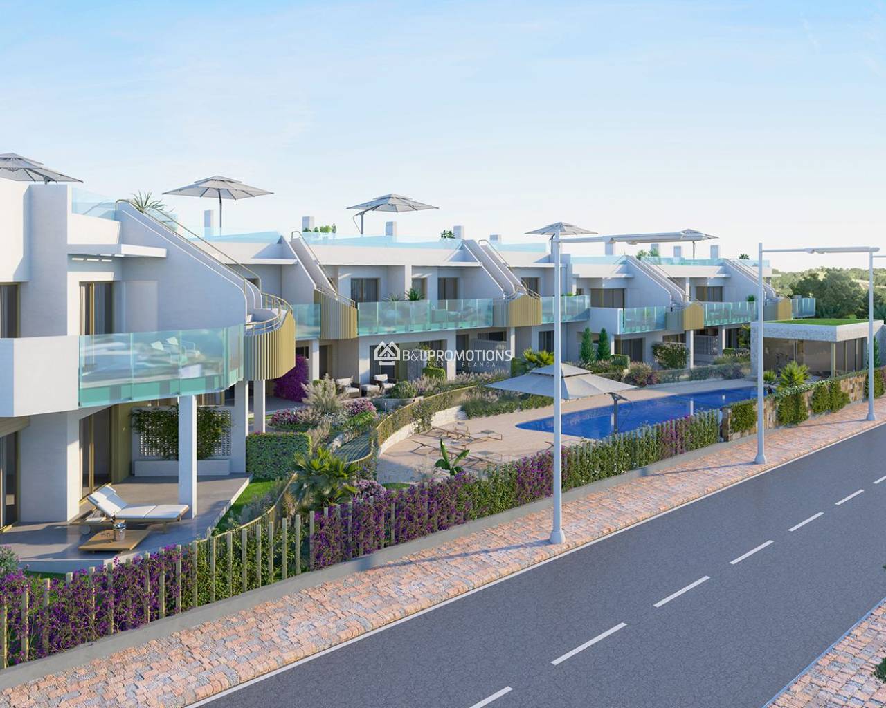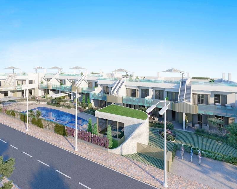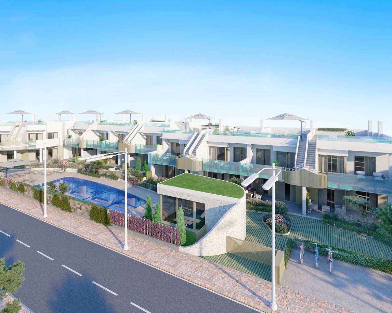 A small complex of 20 houses, swimming pool and fitness, right along the park in the riverbed and within walking distance to the main street of Pilar de la Horadada. This is the last plot with this fantastic location. At just over 1 km you will find a huge sports complex with an (almost) Olympic indoor swimming pool, tennis courts, padel courts, a climbing wall, running track, etc. The beautiful beach is less than 3 km away. The complex is made with a lot of atmosphere and with high quality. 7 apartments have 2 bedrooms and 2 bathrooms and 13 apartments have 3 bedrooms and 2 bathrooms.