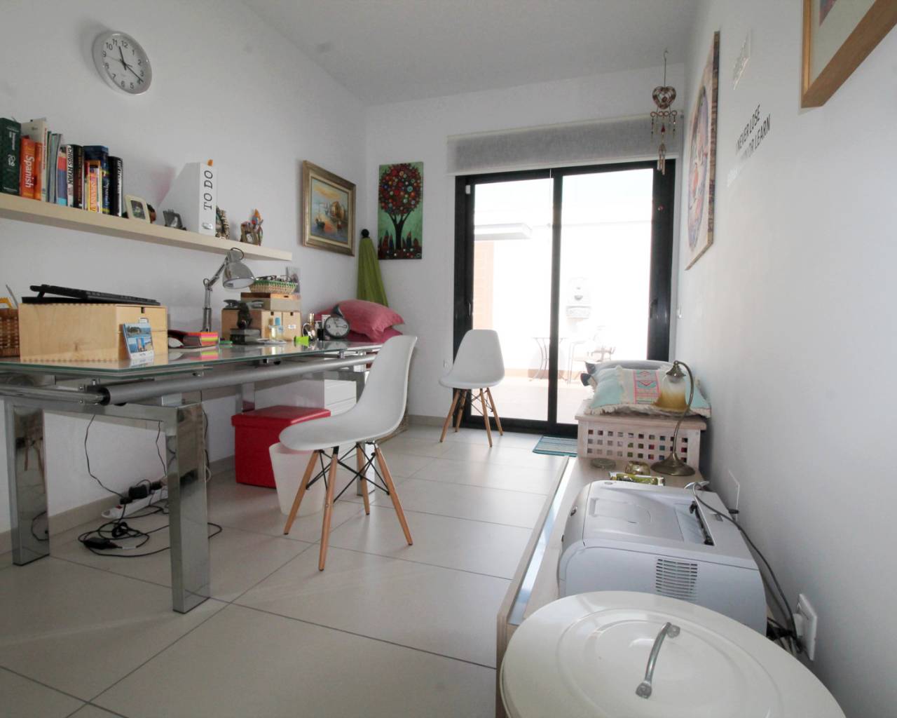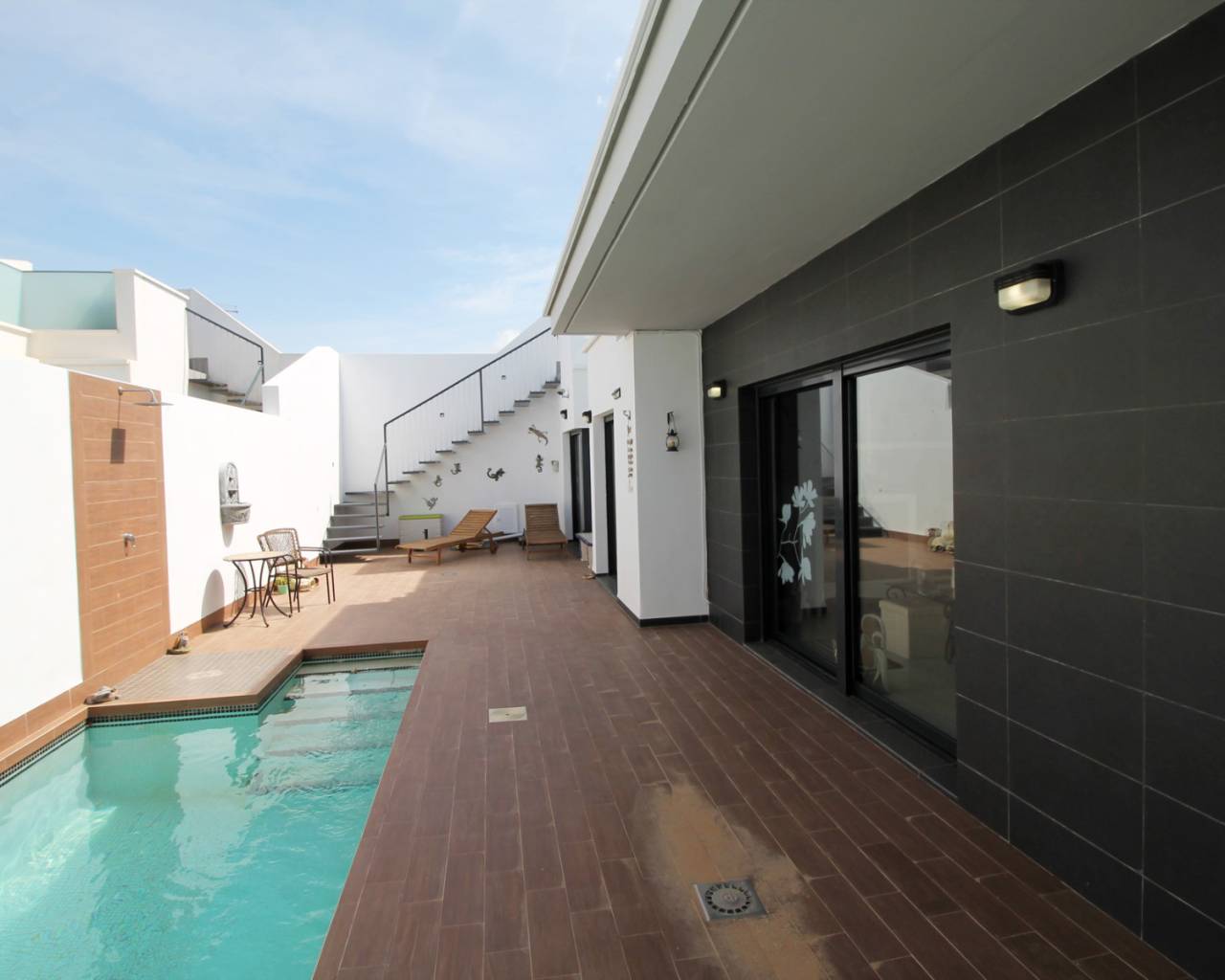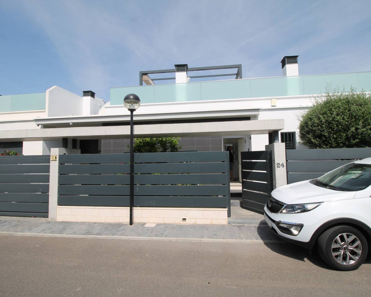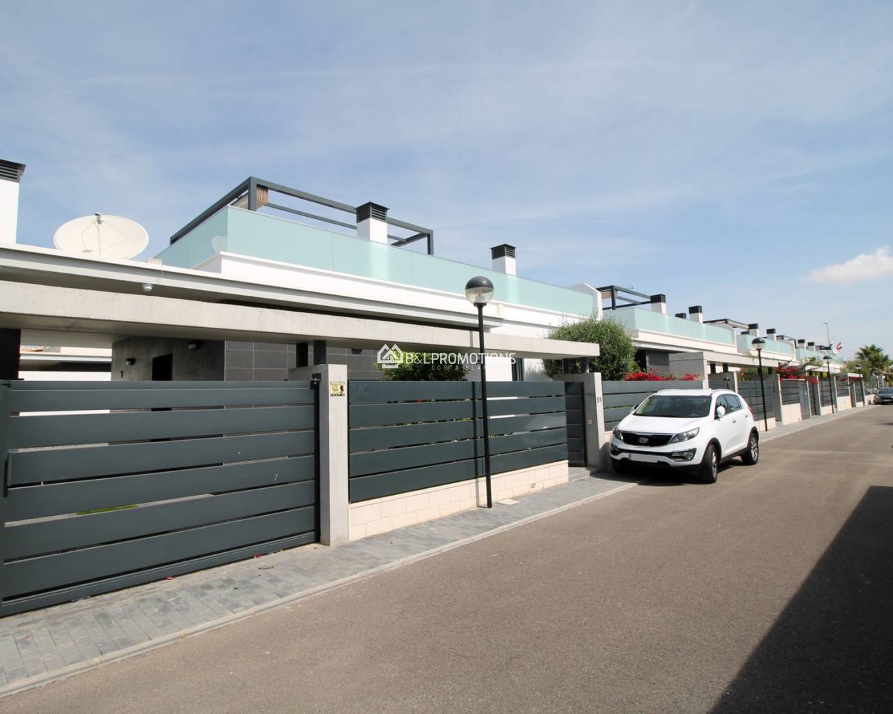 La maison est construite sur un seul niveau. De l'entrée, vous accédez au salon spacieux avec cuisine ouverte, 3 chambres, 2 salles de bain, une belle terrasse couverte avec cuisine d'été et une terrasse ouverte avec piscine privée. De la terrasse, un escalier mène à un eénorme solarium offrant une belle vue dégagée. Le complexe résidentiel dispose également d'une piscine communautaire.
