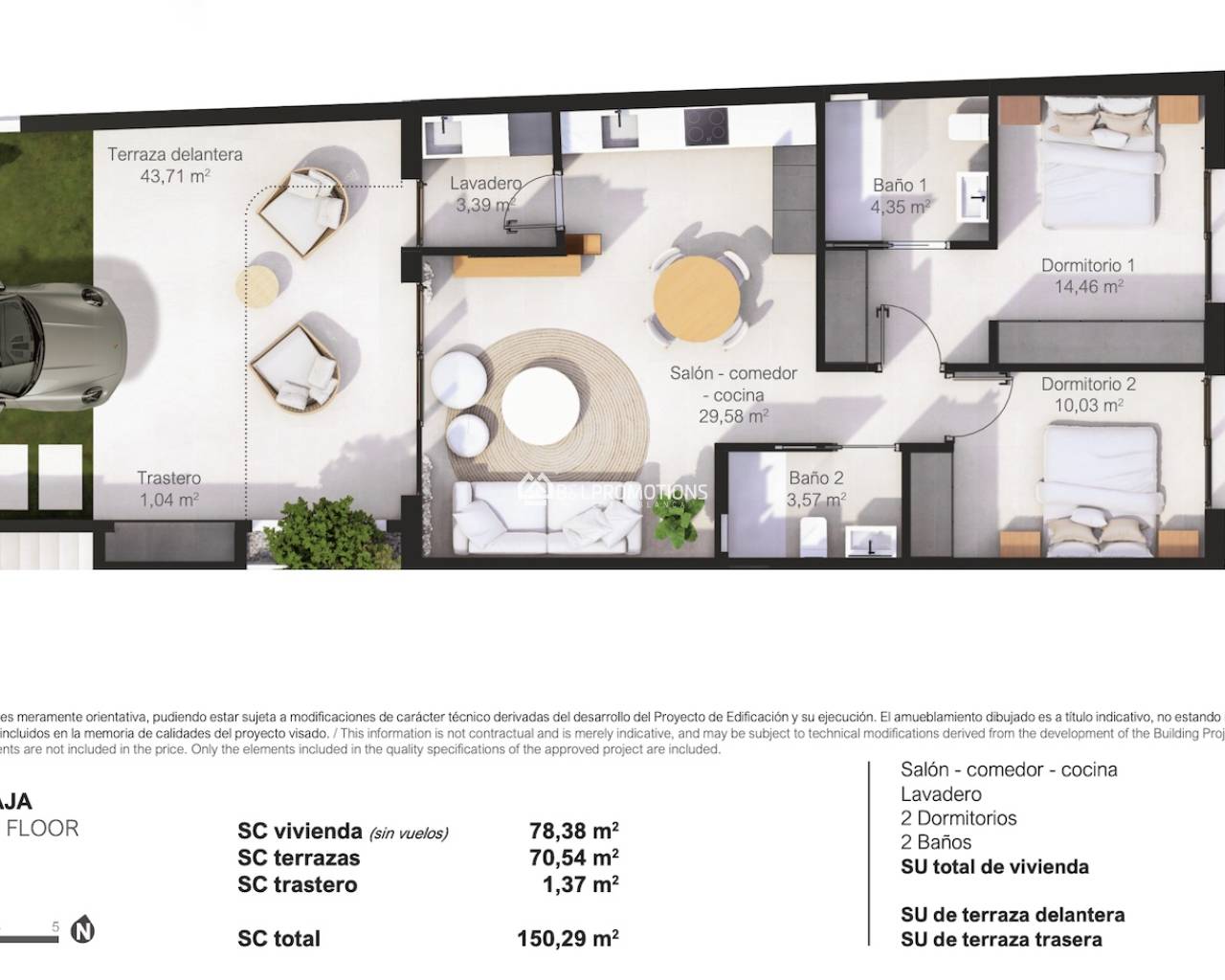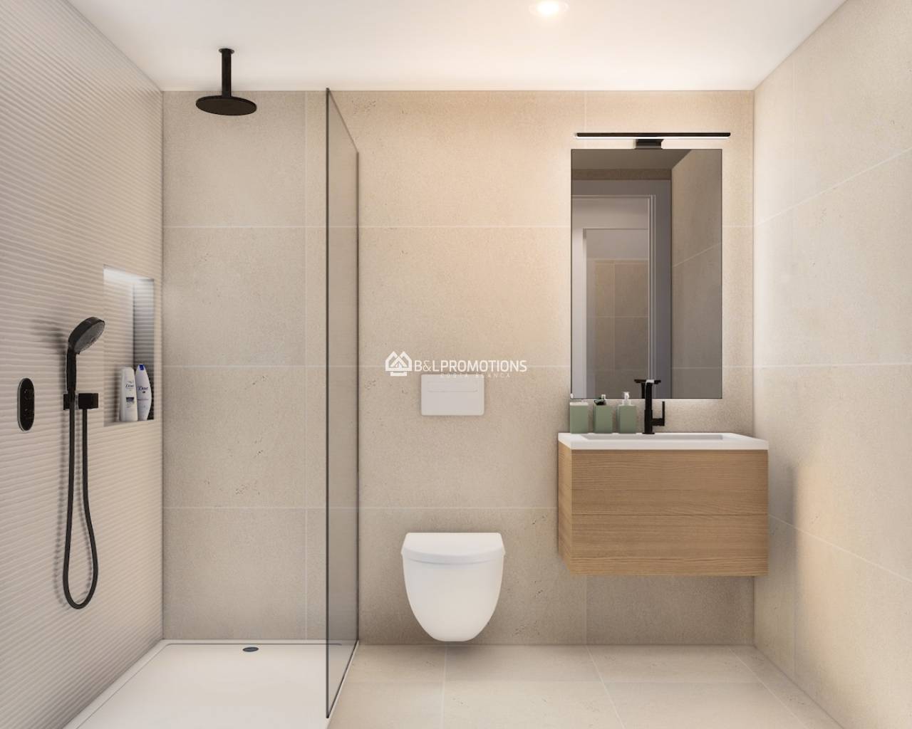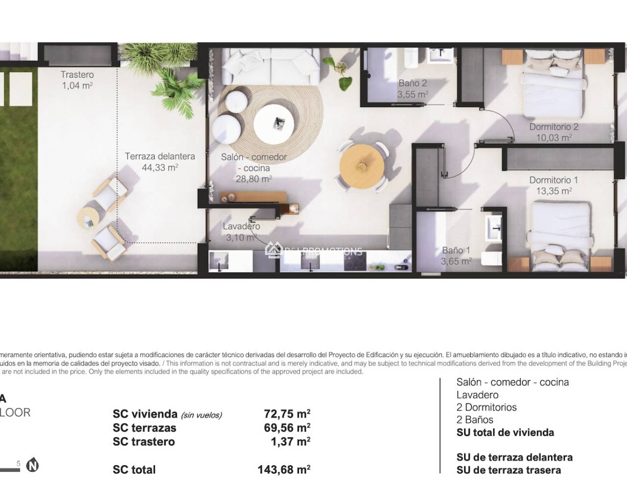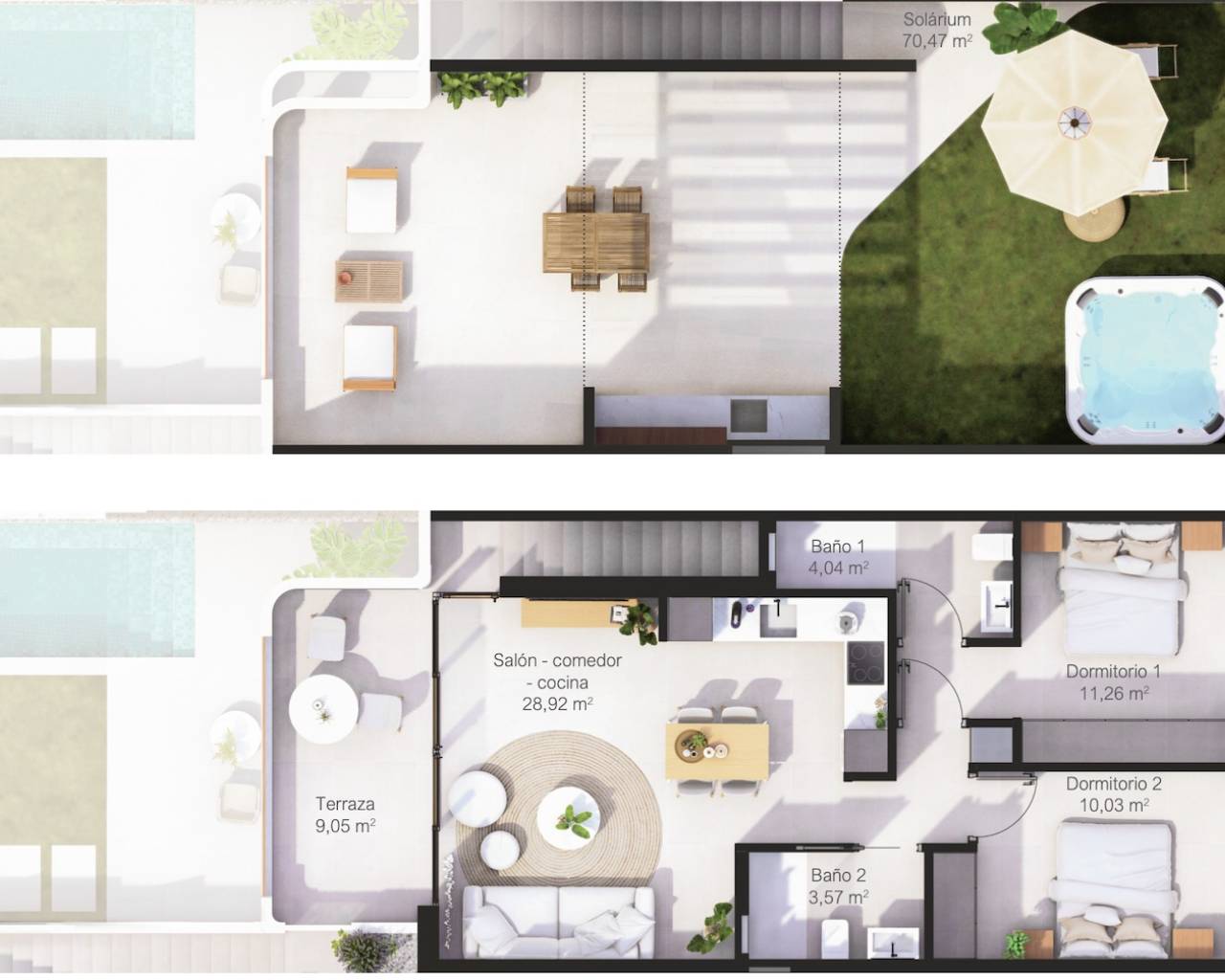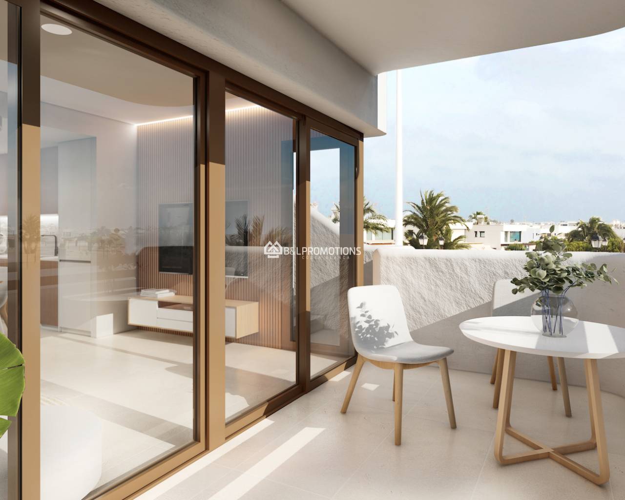 Les appartements ont 2 chambres et 2 salles de bains, un beau salon avec cuisine ouverte et une terrasse spacieuse.