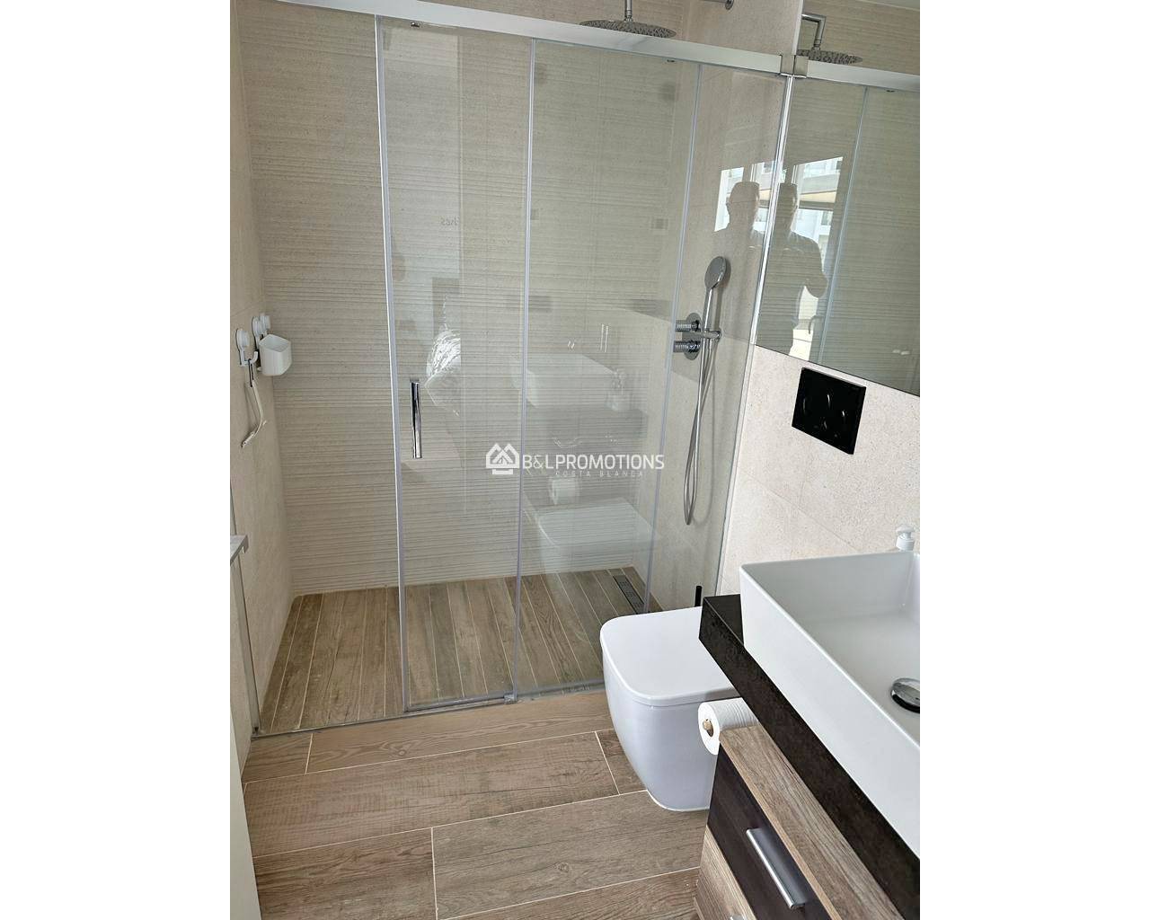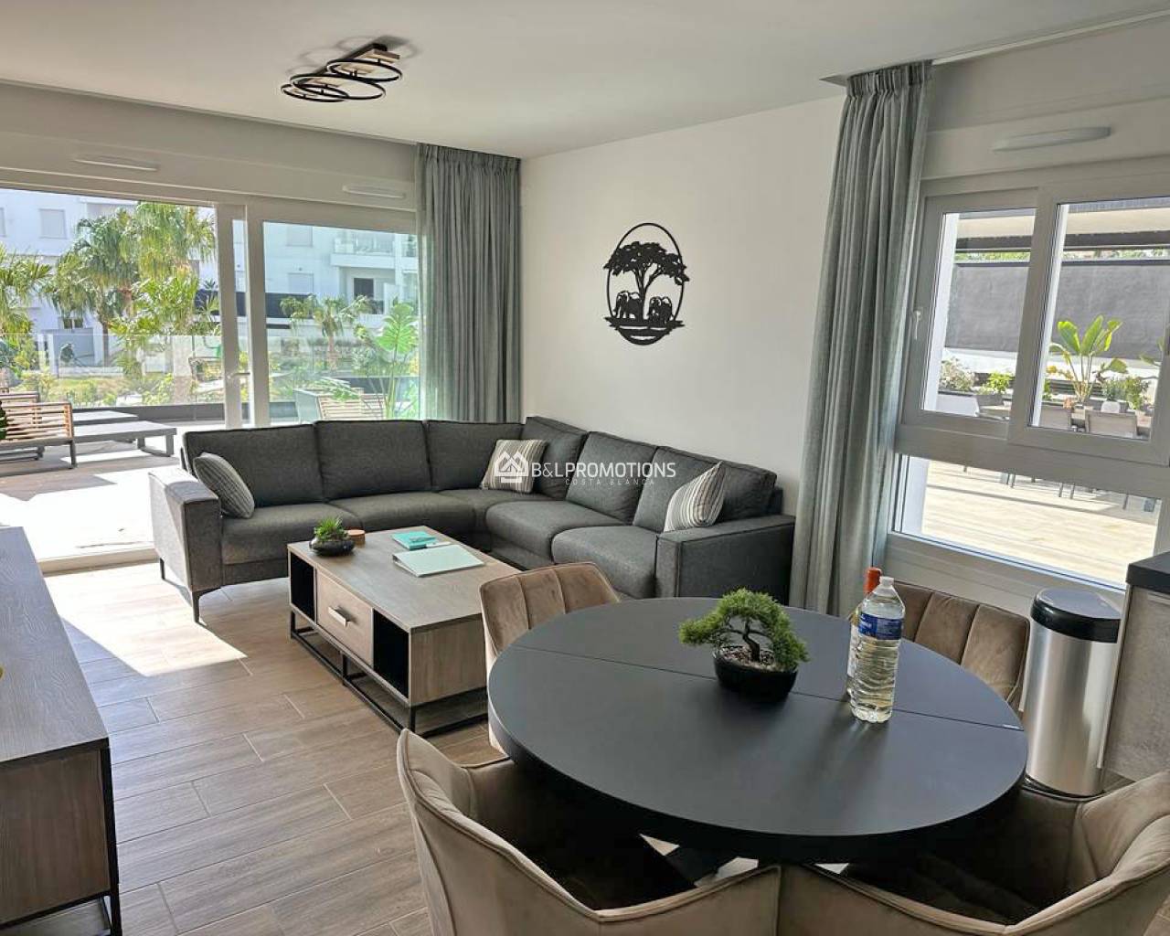 L'appartement se distingue par son espace et son élégance. Il dispose d'une impressionnante terrasse de plus de 100 m², offrant une vue panoramique sur les jardins tropicaux. L'intérieur est conçu avec une grande attention aux détails, comprenant un salon spacieux, une cuisine moderne à concept ouvert, trois chambres et deux salles de bains complètes. La décoration soignée crée une ambiance accueillante et sophistiquée.