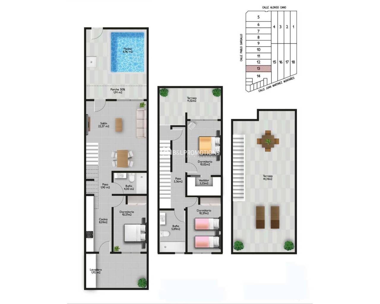 Gyönyörű otthonok 3 hálószobával, 2 fürdőszobával és ezen felül saját úszómedencével. Minden ingatlanhoz saját tetőterasz is tartozik, így maximálisan élvezheti a gyönyörű spanyol időjárást. A házak számos extrával vannak felszerelve, mint minden elektromos berendezés, elektromos redőnyök, külső és belső LED világítás, valamint napelemek előszerelése.