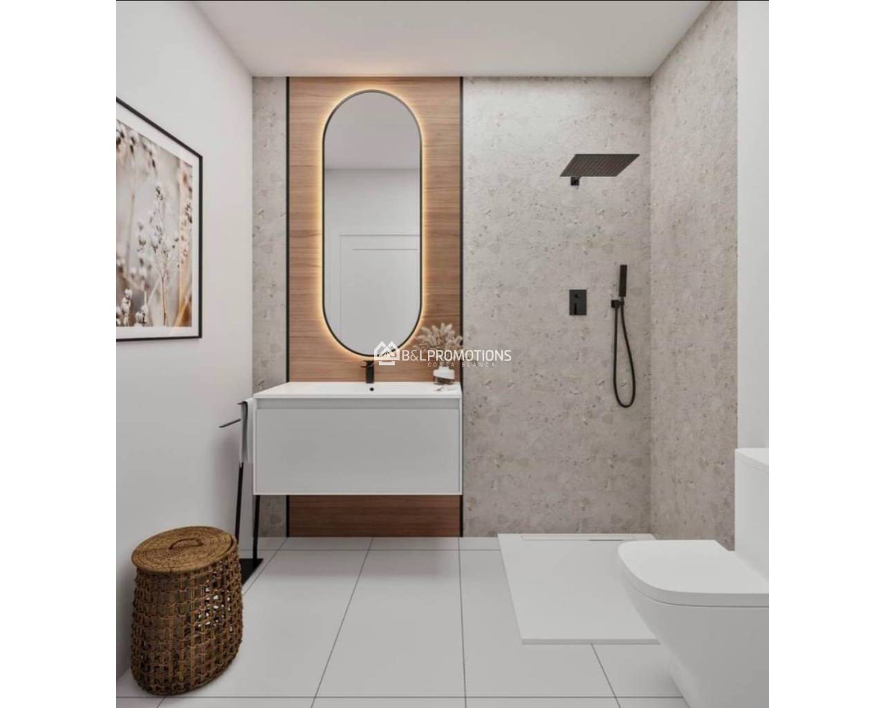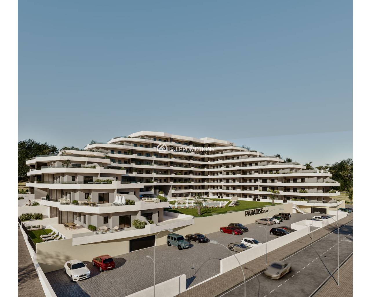 Gyönyörű lakópark tágas, 2 vagy 3 hálószobás lakásokkal, 2 fürdőszobával, tágas nappalival, amerikai konyhával és nagy terasszal és/vagy erkéllyel.