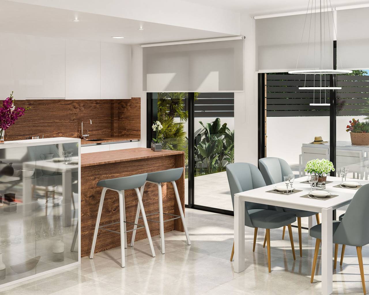 In Golf-resort La Finca, Algorfa, kan men een nieuw complex vinden met individuele villas. La Finca Golf heeft 18 holes, waar elk jaar wel een belangrijk toernooi gespeeld wordt en waar aan de rand van de golfbaan Hotel La Finca zich bevindt. Het complex bevindt zich op 3 km.van  Algorfa, een klein typisch Spaans dorpje, waar men winkels, restaurants,bars en recreatie te vinden is, ook al moeten we niet vergeten dat ook in de zone van de golfbaan men ook deze services kan vinden. Het strand van Guardamar is te vinden op zo’n 10 minuten afstand en het winkelcentrum La Zenia Boulevard en de stranden op zo’n 15 minuten. Het vliegveld van Alicante is te bereiken in ongeveer 40 minuten. Deze woning wordt gebouwd in een zone van La Finca Golf waar men een mooi uitzicht heeft en kan genieten van de groene omgeving. Het heeft 3 slaapkamers en 3 badkamers verdeeld over 2 verdiepingen. De woonruimte met open keuken is ruim met veel ramen, sommige vaste en andere met schuifdeuren die direct toegang geven tot de zone waar men het zwembad kan vinden en het terras. Vanaf de bovenverdieping kan men naar het dakterras waar men versteld zal staan van het schitterende uitzicht. De woning heeft ook een grote garage met een ingang via een groot patio. De materialen die gebruikt zijn voor deze woning zijn modern en van hoge kwaliteit. Er is goed nagedacht over details wat men ook terug kan vinden in de afwerkingen.