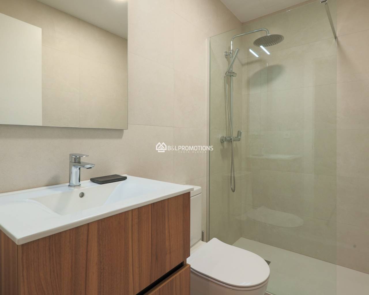 De villa’s beschikken over drie ruime slaapkamers, elk met een en suite badkamer, een extra gastentoilet en een open leefruimte van meer dan 40 m² met veel natuurlijk licht. De volledig uitgeruste keuken sluit naadloos aan op het leefgedeelte en biedt directe toegang tot het ruime terras met privézwembad. Een opvallend detail is het grote schuifraam van meer dan 4,5 meter breed dat volledig in de muur verdwijnt, waardoor binnen- en buitenruimte één geheel worden.
