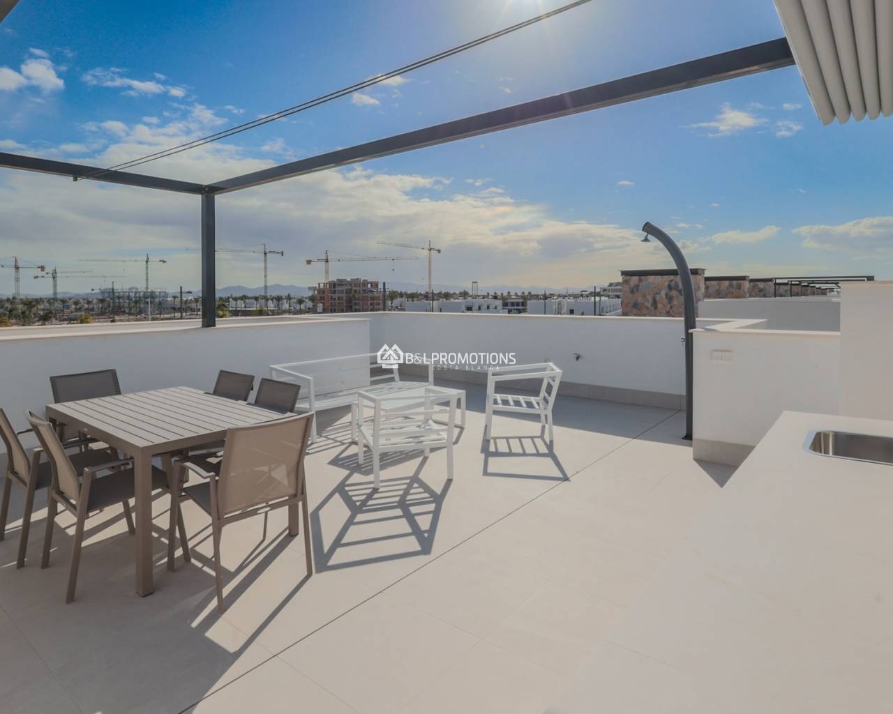 Op het dakterras geniet je van een panoramisch uitzicht over het resort. De voorinstallatie voor een jacuzzi en buitenkeuken maken het plaatje compleet. Bovendien zijn tal van extra’s inbegrepen in de prijs, zoals alle elektrische toestellen van topkwaliteit en een volledig geïnstalleerde airco.
