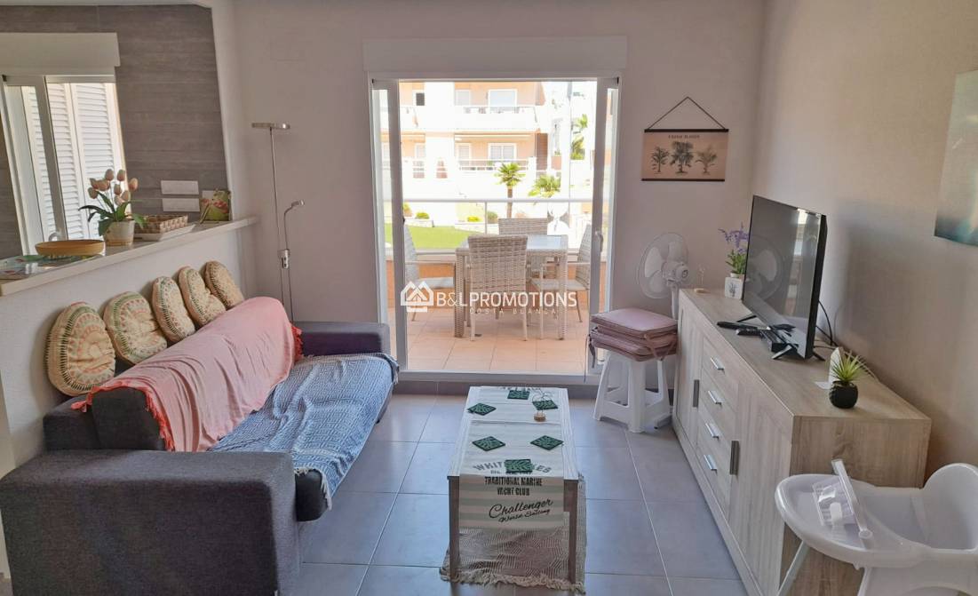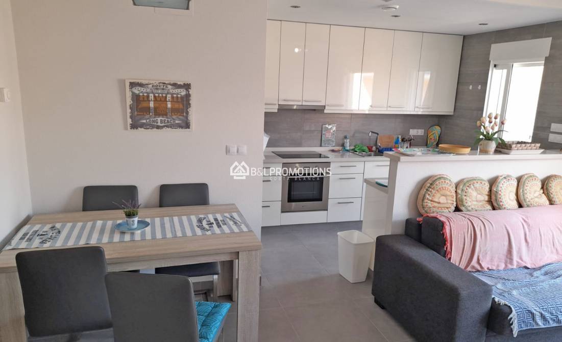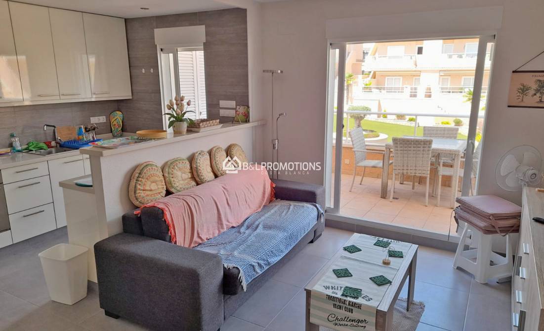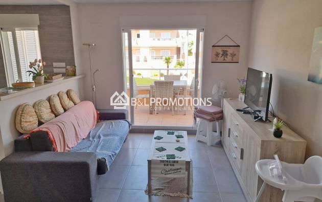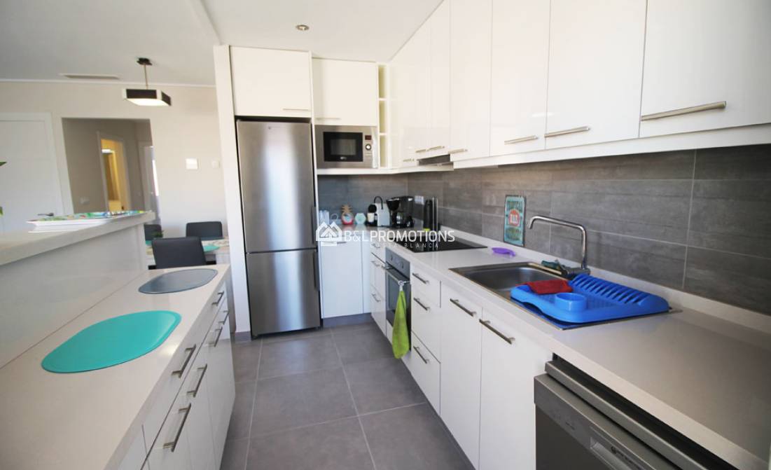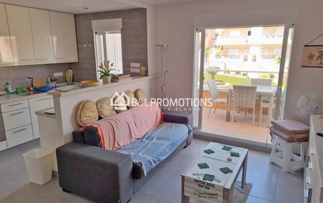 Via een gedeelde loopbrug bereikt u het appartement, dat beschikt over een lichte woonkamer met grote schuifpuien die uitkomen op het terras. De open keuken is volledig uitgerust en ontworpen om aan al uw dagelijkse behoeften te voldoen.