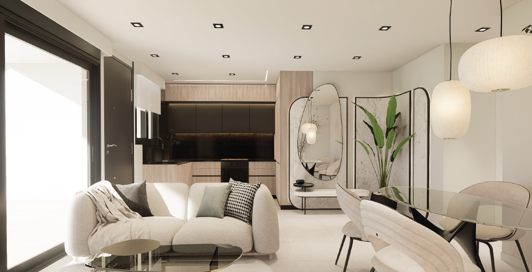 Salón luminoso con cocina abierta