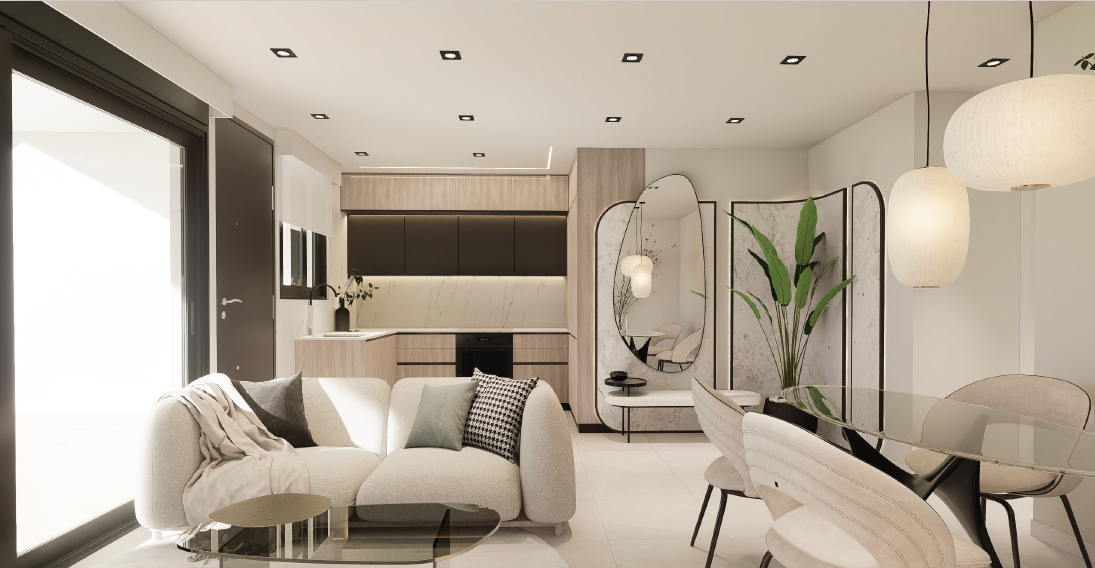 Salón luminoso con cocina abierta