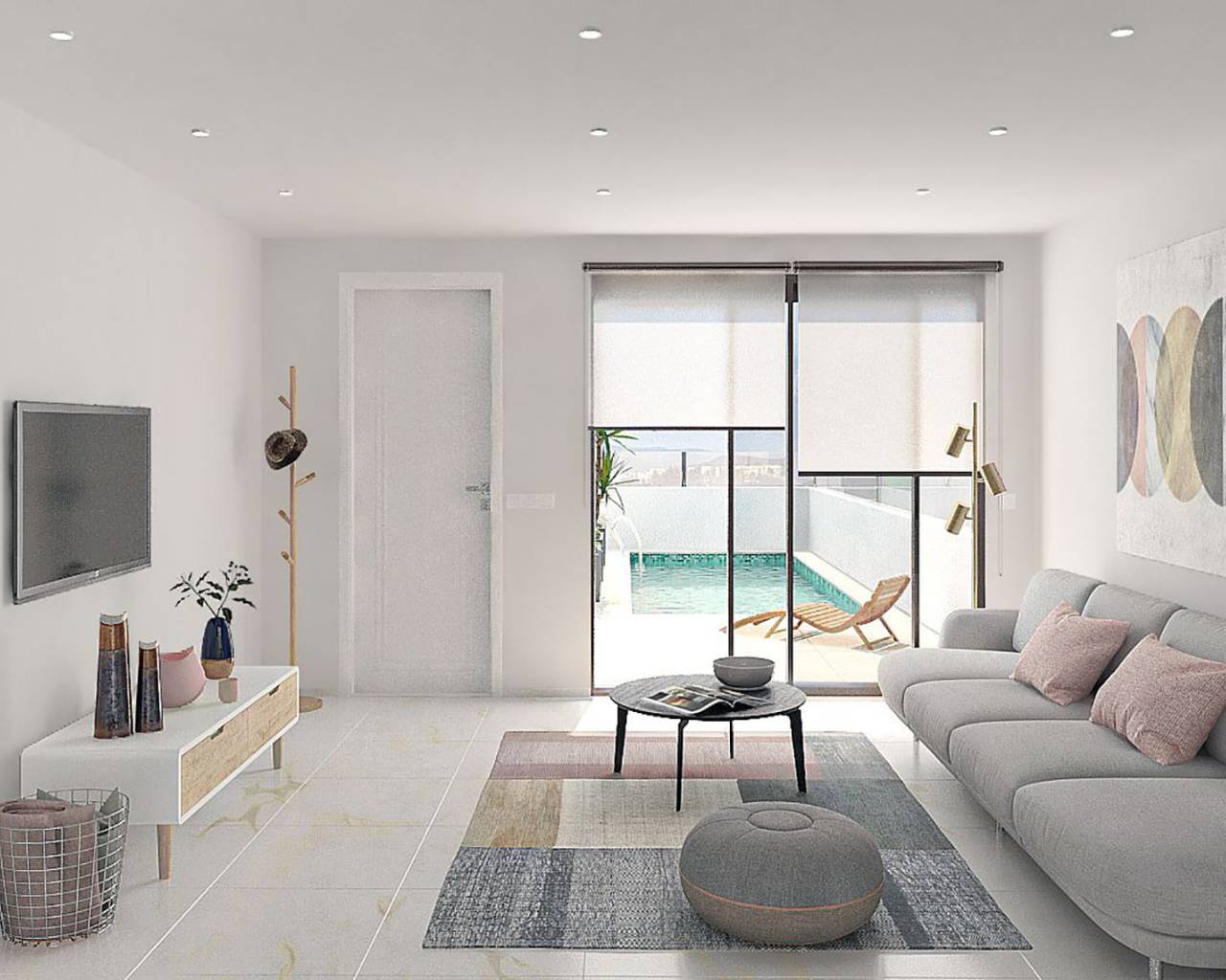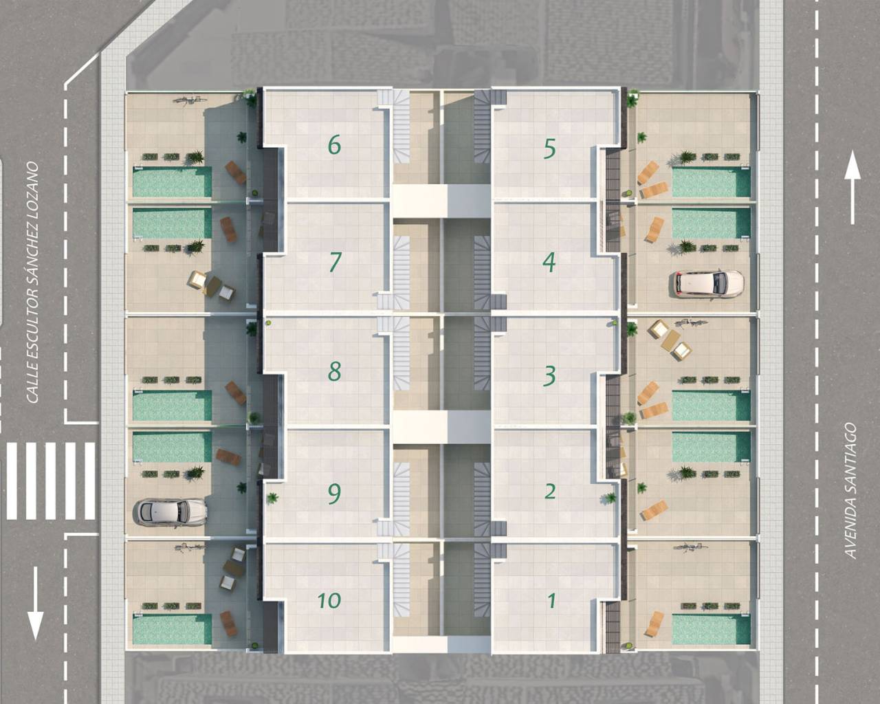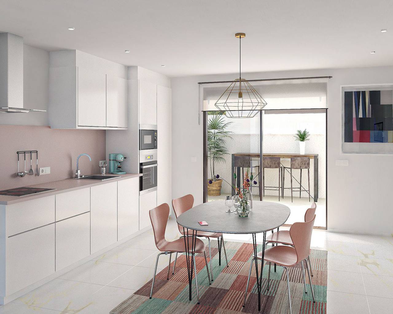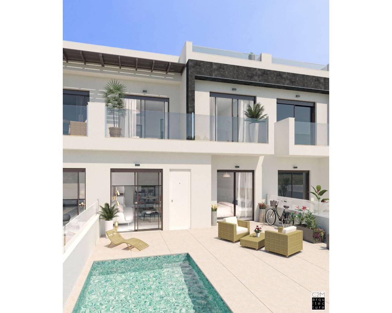 En San Pedro del Pinatar un pueblo de pescadores y a solamente 500 metros del centro donde puede encontrar toda clase de tiendas, restaurantes, bares y ocio, hay un complejo nuevo de chalets adosados. La playa del Mar Menor está a 2 km.y se puede llegar perfectamente en bicicleta por el carril especial para ella que tiene el pueblo. De camino a la playa se pasa por un parque natural protegido donde puede encontrar casi siempre Flamengos y una naturaleza espectacular así como también sus instalaciones de recogida de sal de los lagos que están allí. Los chalets tienen todos 3 habitaciones y 3 baños, distribuidas en 2 plantas. El salón-comedor-cocina es muy grande e luminoso por tener varias ventanas correderas. Hay un patio donde se ubica la lavadora, pero por ser bastante grande también puede servir como trastero. Los acabados y materiales modernos son todos de alta calidad y destacamos especialmente el baño doble en la planta de arriba y un espacio destinado a zona de lectura o estudio. La zona de jardín tiene una piscina privada y espacio suficiente para aparcar un coche en la propia parcela.