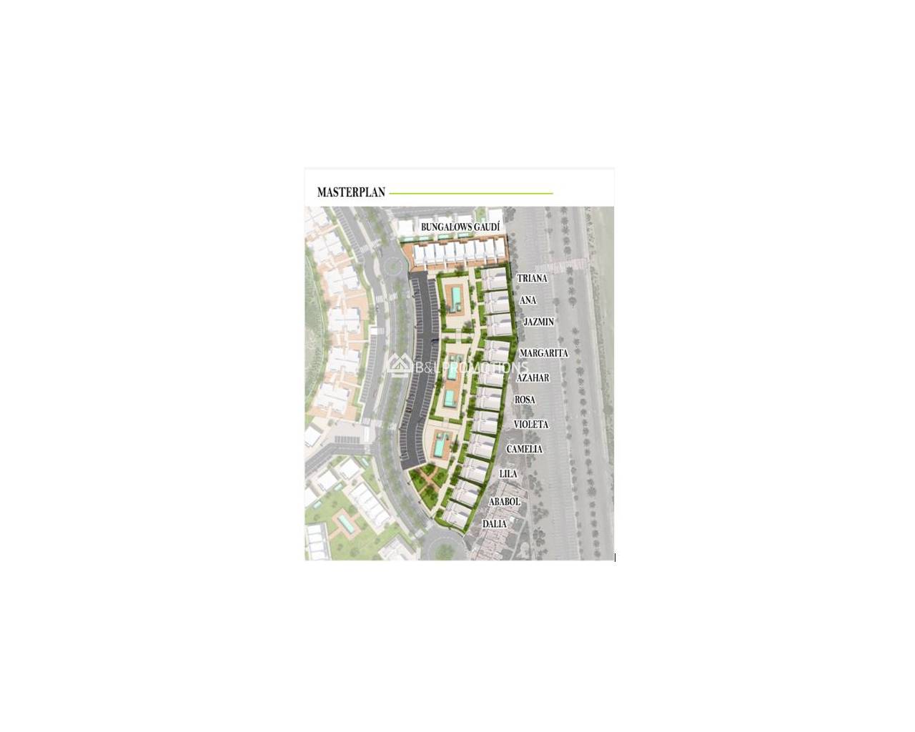 Todas las viviendas tipo bungalow disponen de 3 dormitorios, 2 baños, un amplio salón con cocina americana y terrazas con vistas a la piscina y zonas ajardinadas.
