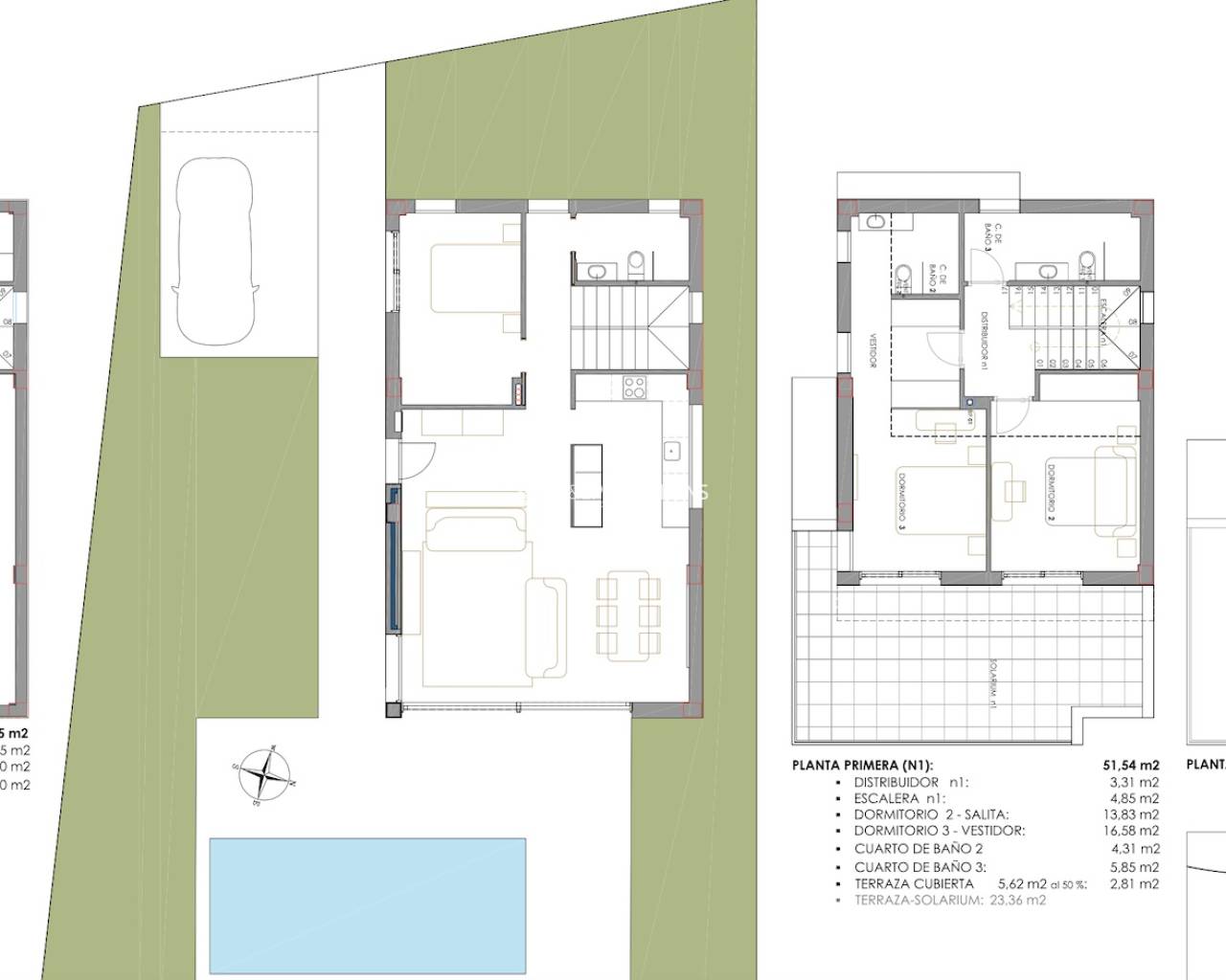 Las casas están construidas en amplias parcelas y están muy bien acabados. Tienen 3 dormitorios, 3 baños, un hermoso salón con cocina americana y una amplia terraza con vistas a su propia piscina privada.