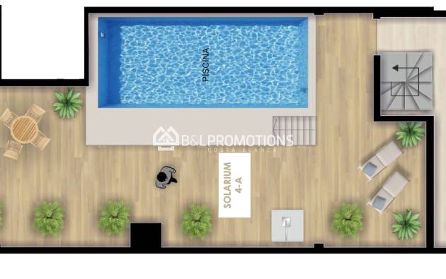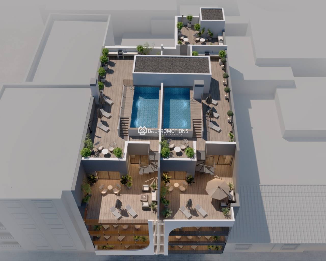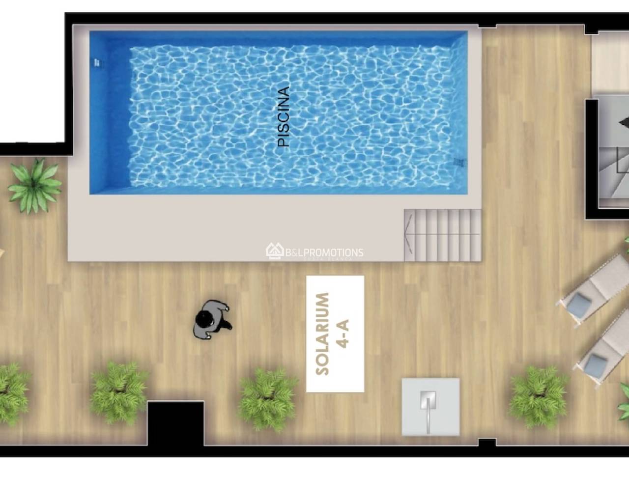 En la azotea hay un hermoso solarium con piscina comunitaria, donde es dichoso relajarse con hermosas vistas.