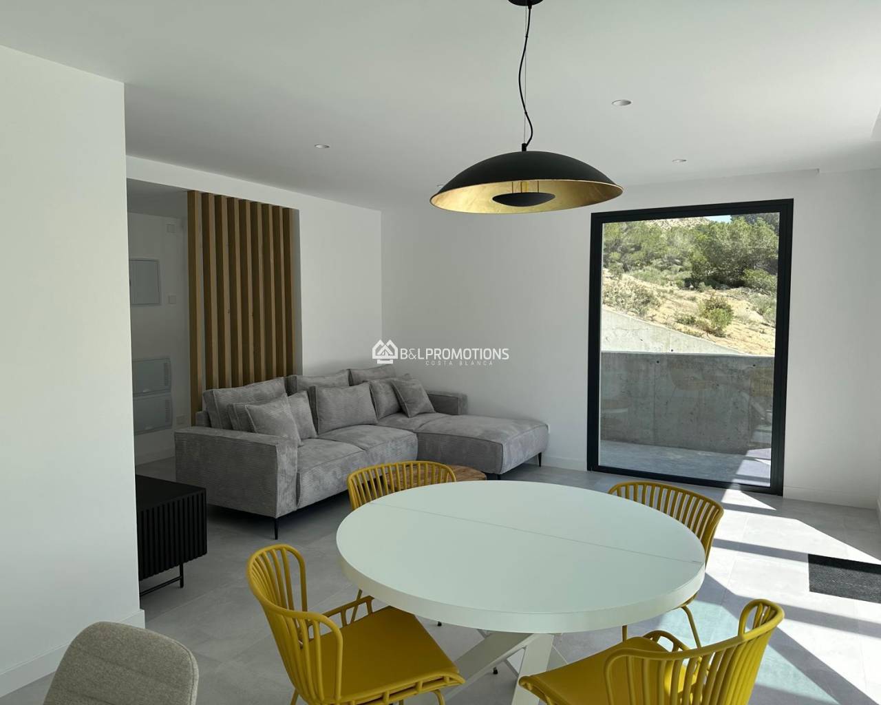 En el interior encontrarás un salón amplio y luminoso, con grandes ventanales correderos que permiten una entrada generosa de luz natural. La cocina abierta se integra perfectamente con el espacio de estar, y hay un práctico lavadero con lavadora, secadora y calentador. Además, cuenta con dos dormitorios cómodos y dos baños modernos.