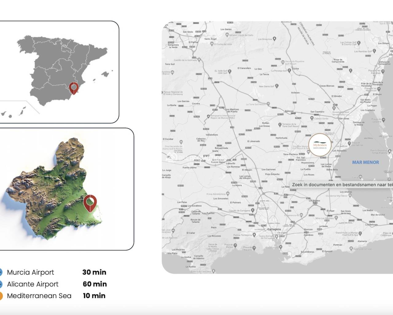 La ubicación es simplemente excepcional: dentro del Santa Rosalía Lake Resort, un exclusivo y seguro complejo residencial con un impresionante lago artificial, zonas verdes y numerosas instalaciones deportivas. A tan solo unos minutos se encuentra Los Alcázares, un encantador destino costero en la Costa Cálida, famoso por su paseo marítimo y las bonitas playas del Mar Menor.